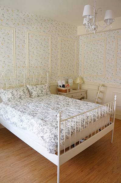一整面的碎花牆鑲著潔白的蝴蝶結雕花,浪漫的白窗紗透露著公主的氣息